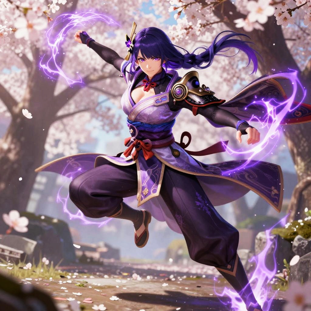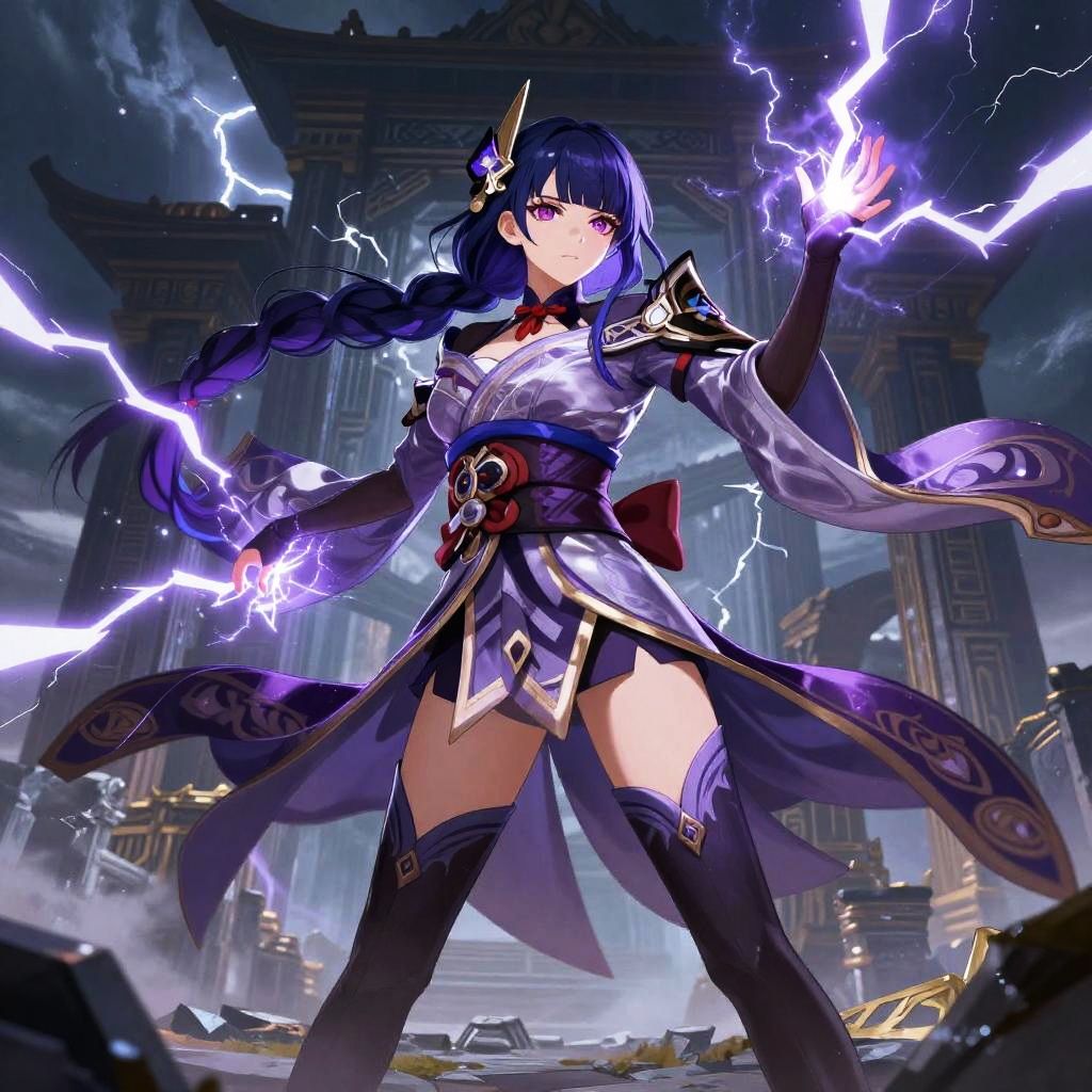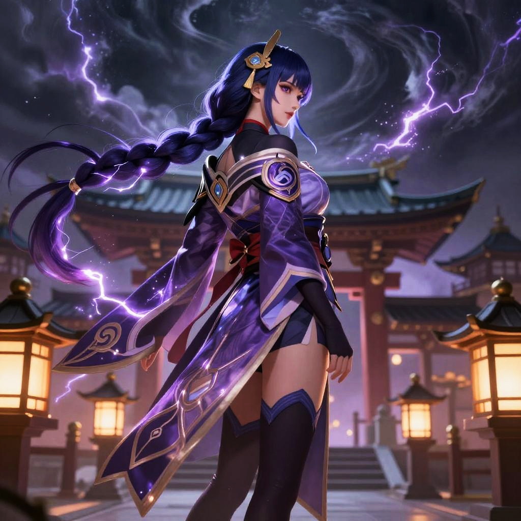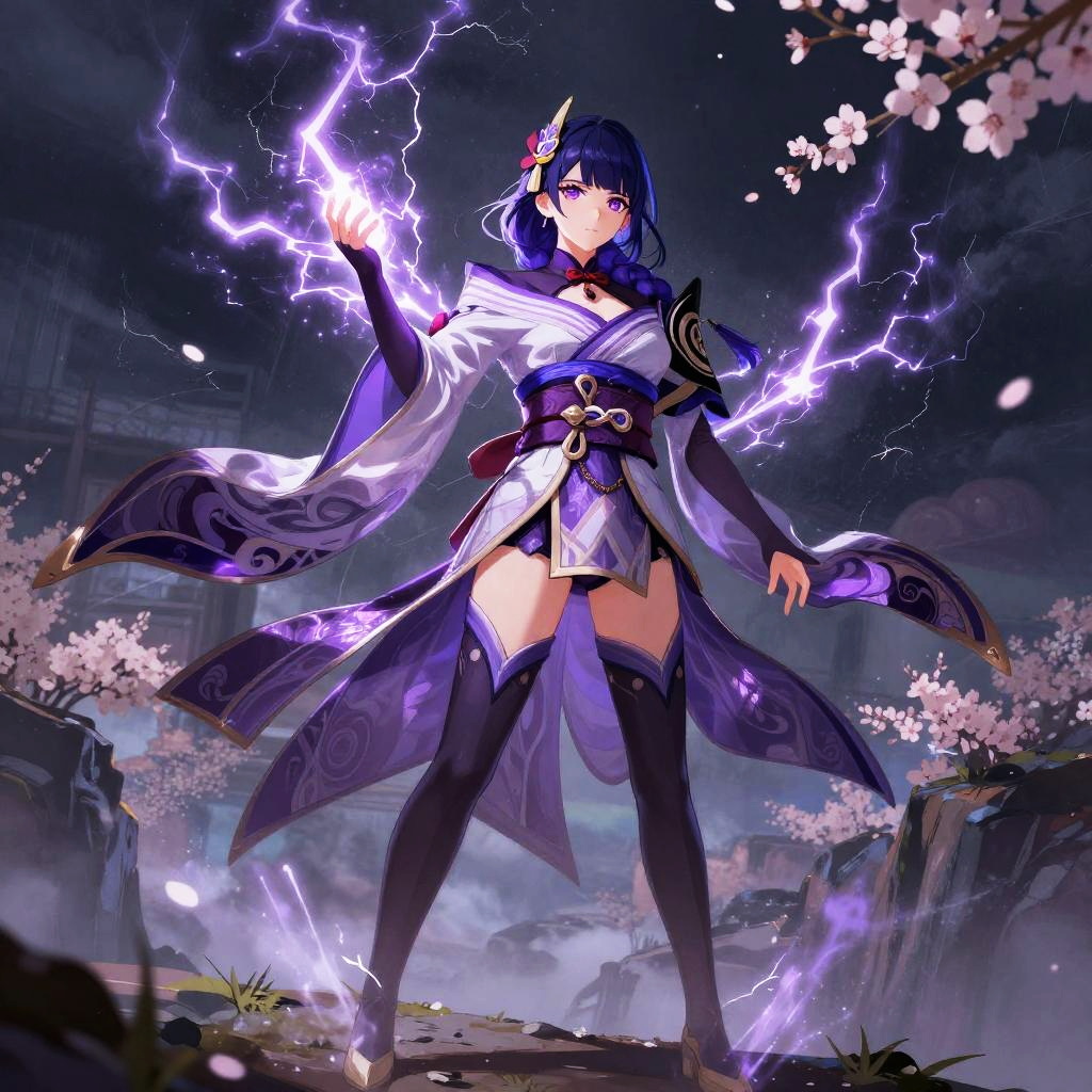 Raiden Shogun concept art portraying a calm and regal figure seated on a throne of lightning, draped in richly detailed robes blending traditional Japanese patterns and futuristic glowing elements, with storm clouds and flashes of electricity framing the scene.