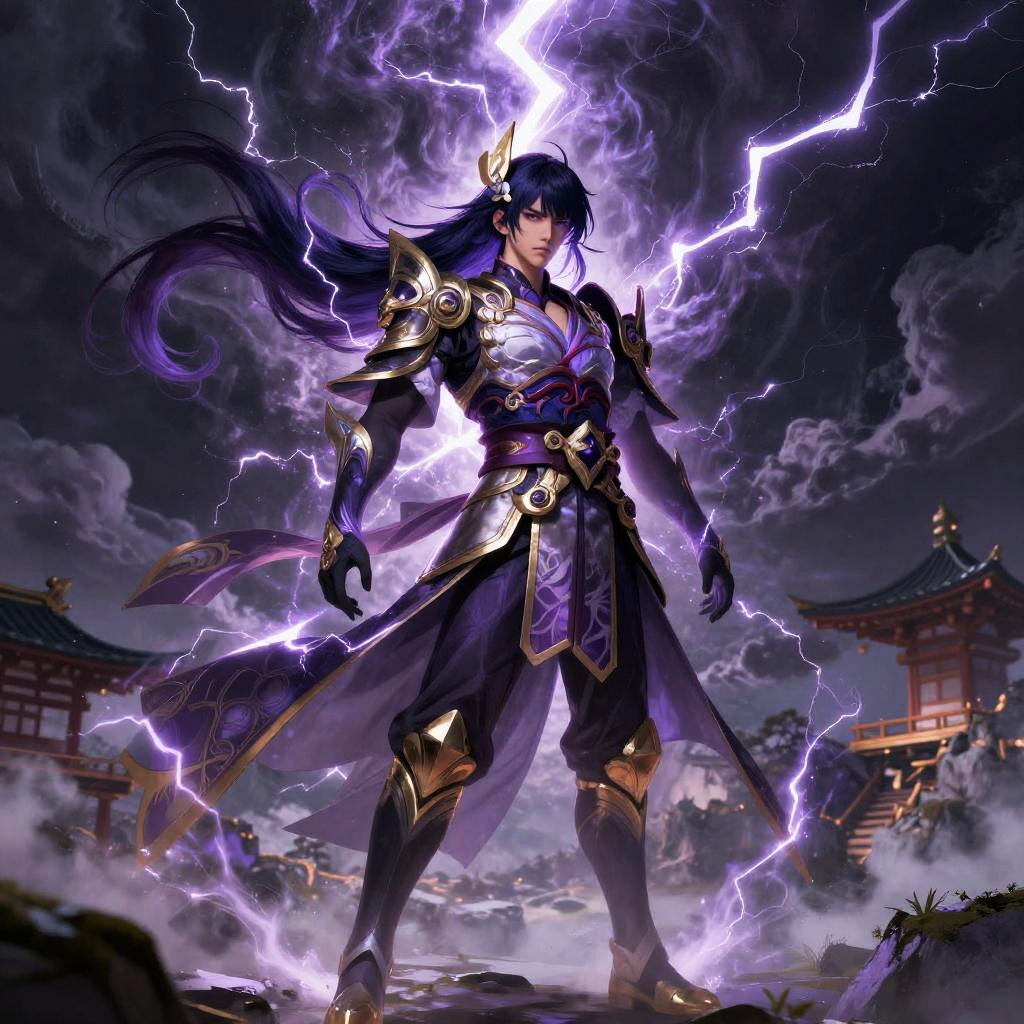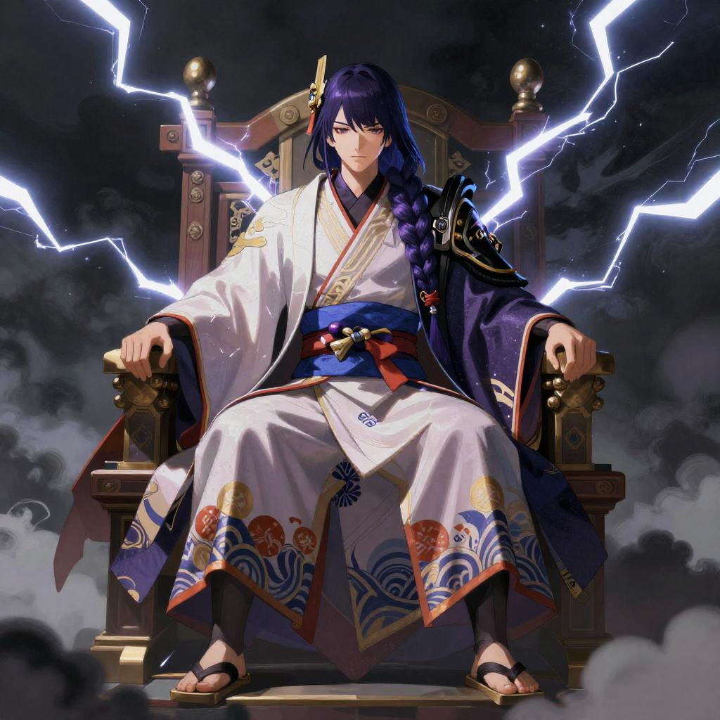 Digital anime-style illustration of a stern, dark-haired man in a white kimono with blue and gold accents, sitting on a thunderbolt-emitting throne
