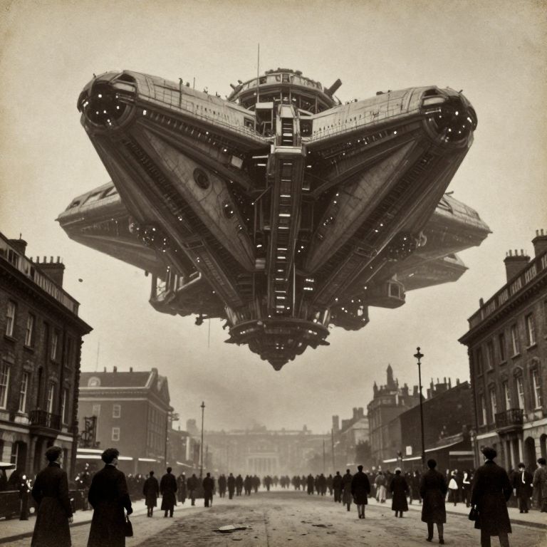 This black-and-white photograph-like CGI image depicts a large, futuristic, spaceship hovering above a crowded, Victorian-era street. The spaceship, with its detailed mechanical components, large engines, and intricate wiring, dominates the sky. Below, numerous people dressed in early 20th-century clothing, including coats and hats, gaze upward in awe. The street is lined with old buildings, some with chimneys emitting smoke. The background shows a foggy skyline with more buildings. The image blends sci-fi elements with historical architecture, creating a striking contrast. The overall tone is nostalgic yet futuristic.