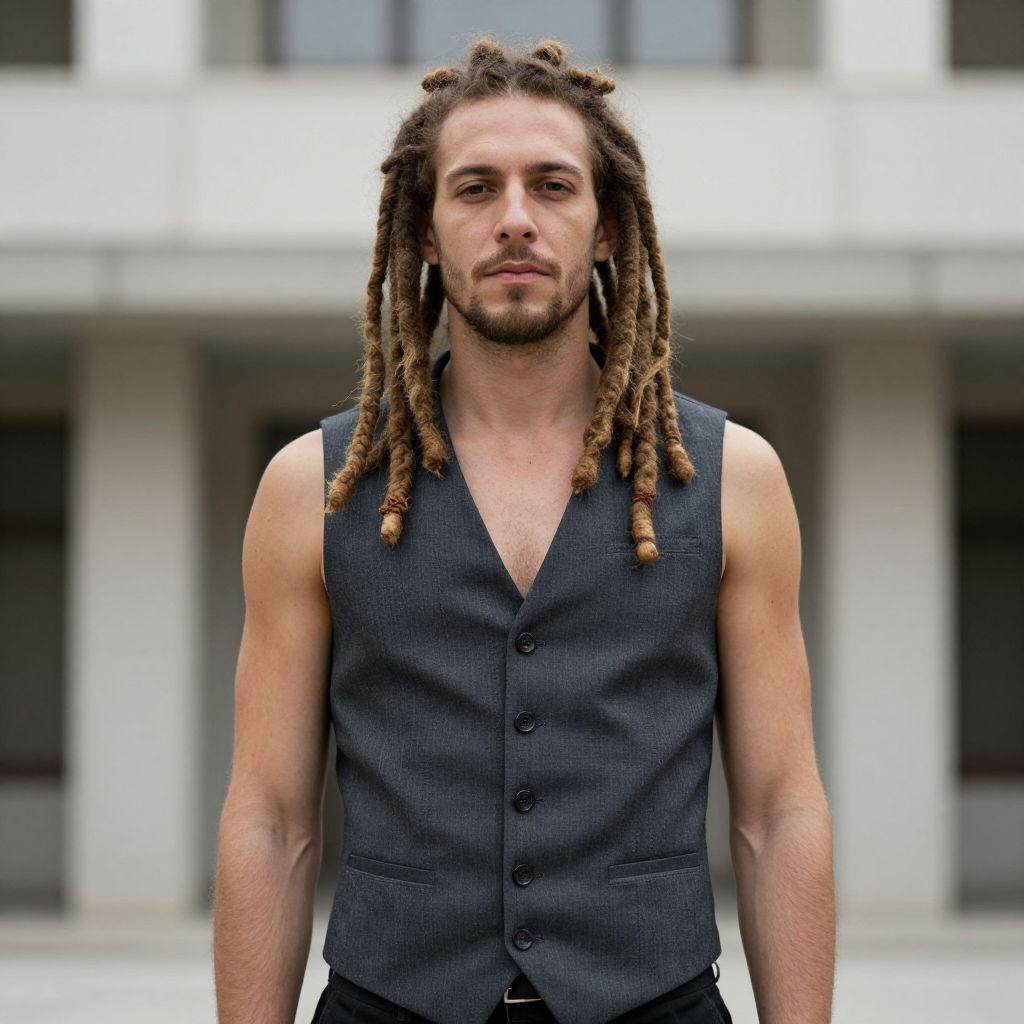 Photograph of a white man with light skin and brown dreadlocks standing in front of a modern, blurred white building. He has a lean, muscular build and is wearing a sleeveless, black, button-up vest over a dark shirt. His expression is neutral, with a trimmed beard and mustache. The background features large windows and columns, adding an urban, architectural element. The lighting is natural, highlighting his defined arm muscles and textured dreadlocks. The overall style is contemporary and minimalist.