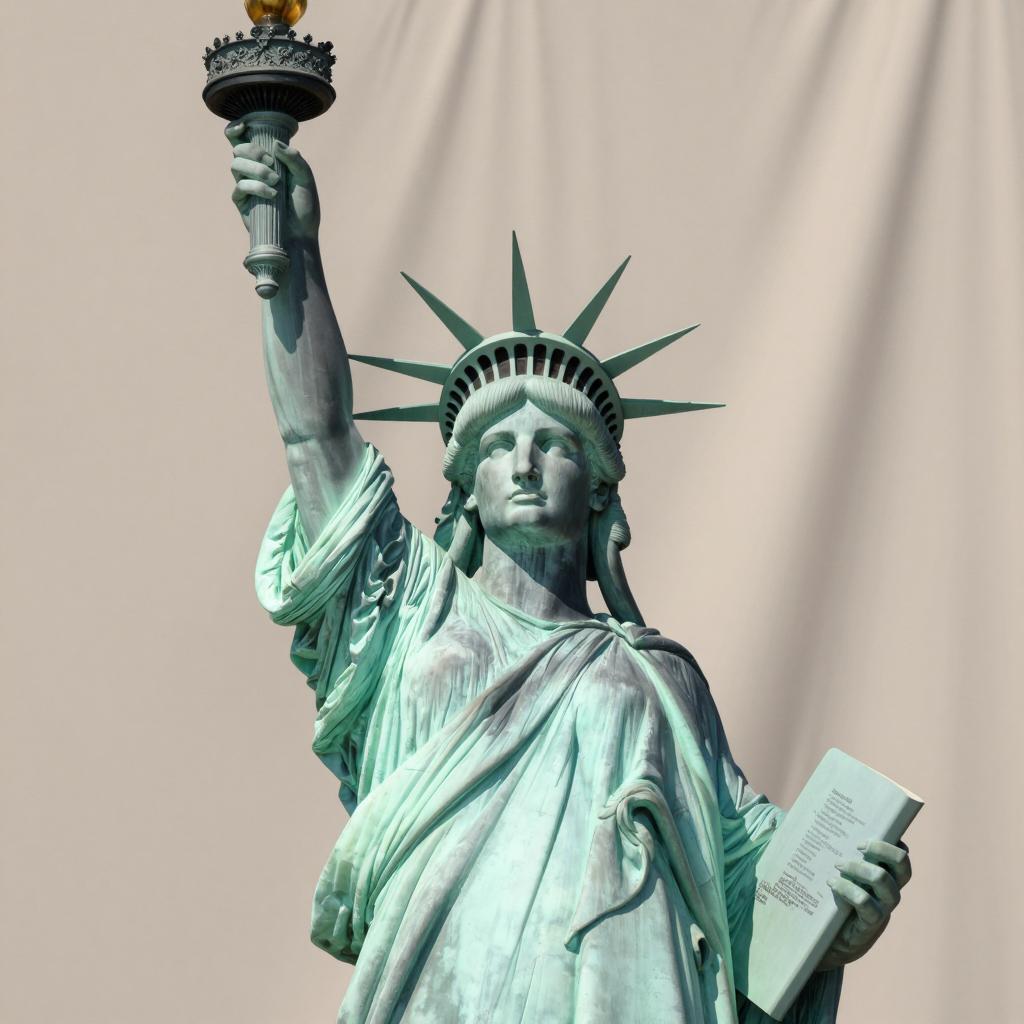 Girl statue liberty costume, photograph of woman standing as Statue of Liberty, wearing replica of Statue of Liberty outfit, green dress with spiked crown, holding torch in right hand and paper in left hand, beige background with draped fabric, realistic style, daytime lighting, serious expression, slight smile, light brown hair, Caucasian, realistic ures, detailed costume, slight digital manipulation, surreal element, blend of human and iconic statue, mixed media, statue with human features