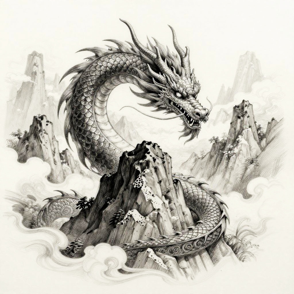 Art sketch portraying a mythical dragon curled around a mountain peak, detailed pencil drawing with intricate scales and fierce eyes, rugged rock textures blending with fantastical elements, dynamic composition with swirling clouds and dramatic lighting, atmospheric fantasy theme.