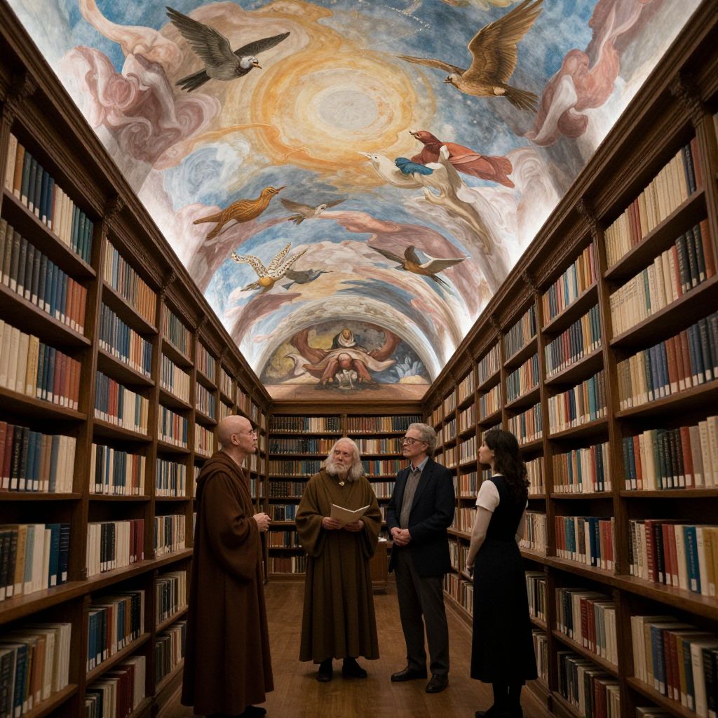 Books line the walls of a grand library, where three figures—a monk, a scholar, and a woman—observe surreal frescoes animating the arched ceiling above, as birds and floating shapes dance against a backdrop of clouds and celestial light.