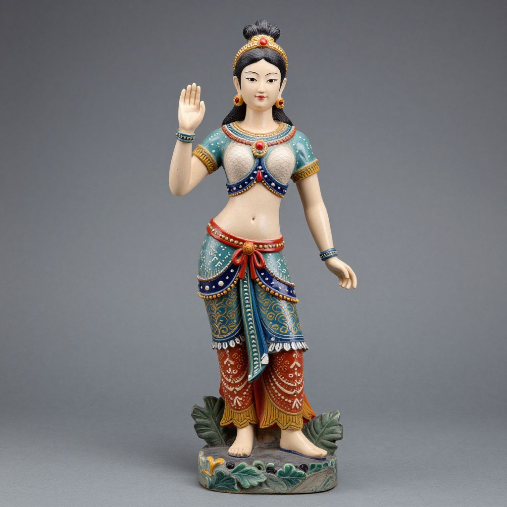 A colorful statue of a woman in a protective stance, adorned with intricate details and vibrant hues.