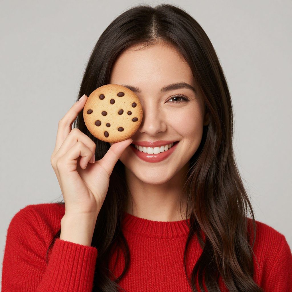 "Woman Cookie, woman in red sweater holding a cookie in front of her face"