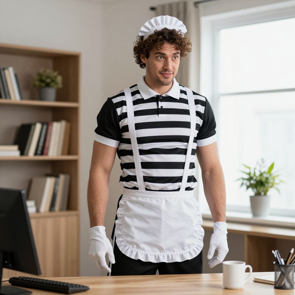 A photorealistic image of a tall, athletic man wearing a full guy maid costume—complete with a black and white striped uniform, white gloves, and a maid’s hat—standing in a well-lit, modern home office with bookshelves, a plant on the windowsill, and a coffee mug on a wooden desk, his face showing focused attention and a slightly playful expression with curly brown hair and a friendly demeanor.