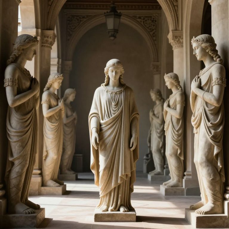 Sentient statues stand solemnly within an ornate, sunlit corridor, flanking a central figure who appears to be the focal point of their attention, as if awaiting a question that will unlock their cryptic secrets.