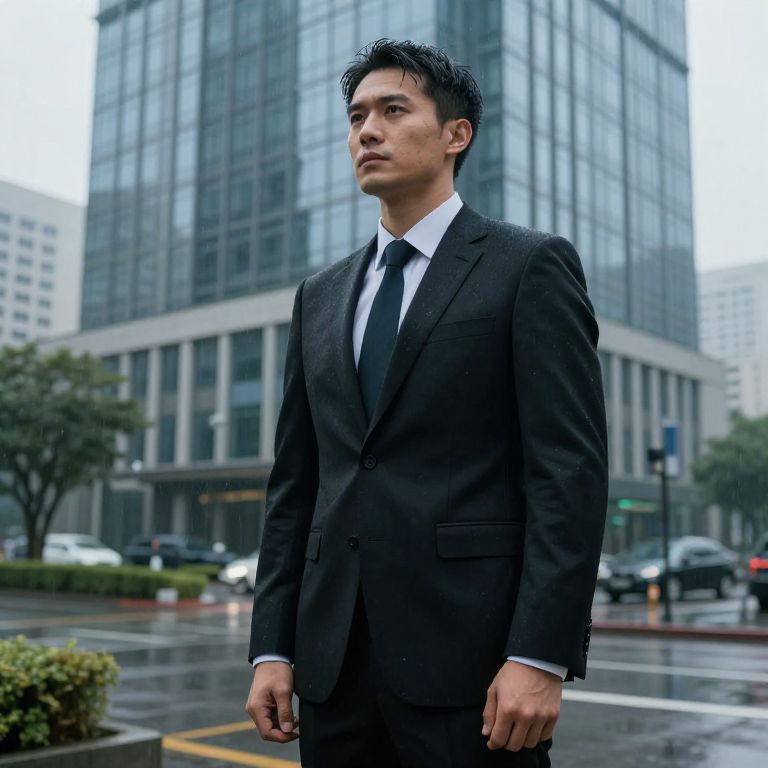 A bodyguard in a modern black suit stands guard outside a high-rise office building during a rainy morning. The keyword is bodyguard prompts. Moody atmosphere, realistic textures, detailed facial expression, subtle tension in posture.