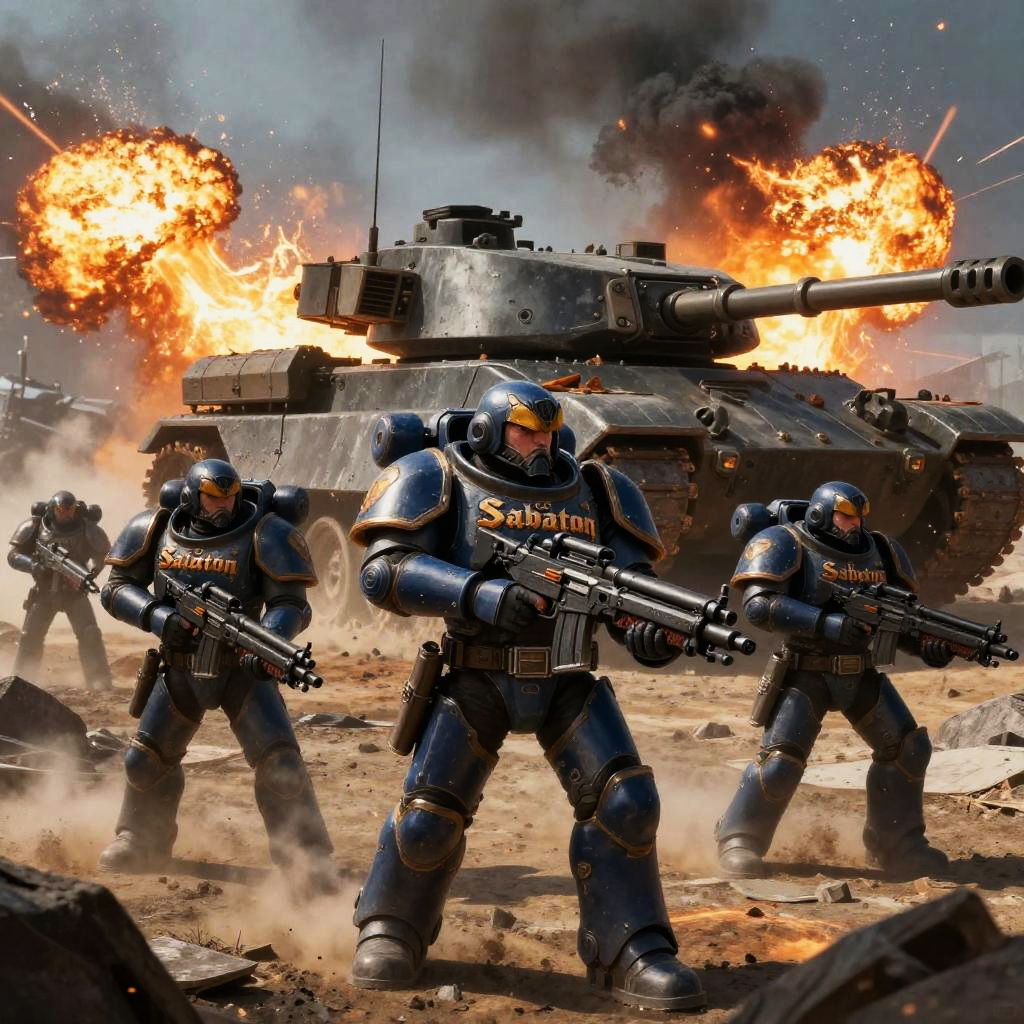 Sabaton-inspired futuristic war scene, armored soldiers wielding advanced weapons, massive tanks rolling over rugged terrain, fiery explosions lighting up the smoky sky, powerful and heroic atmosphere, detailed textures and dynamic composition, digital art style.
