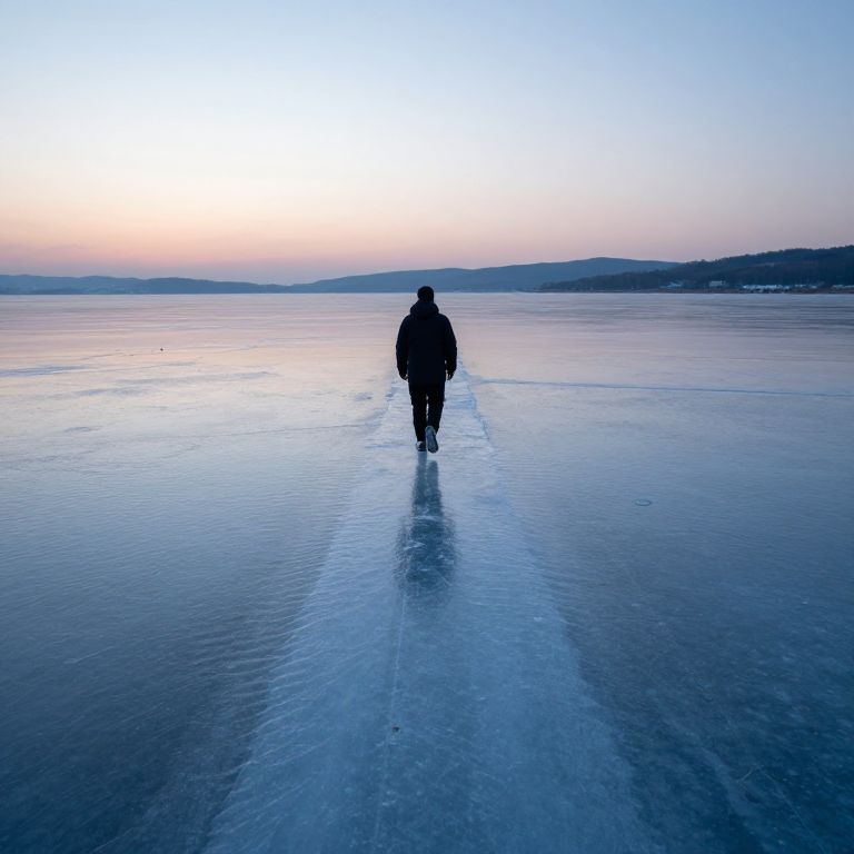 Solitary figure walks along a narrow path of icy ripples, traversing a vast expanse of frozen water beneath a twilight sky, where distant hills fade into the horizon.