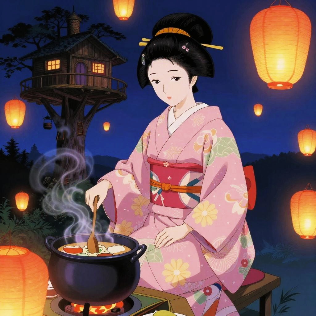 Magenta and teal illustration of a serene geisha, with warm paper lantern glow, against a traditional Japanese garden.