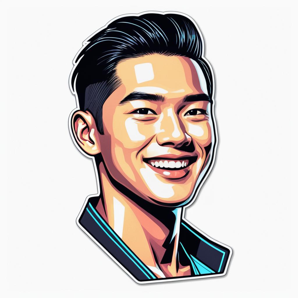 A die-cut sticker illustration of a 28-year-old South Asian man with medium-length black hair, styled in a classic 90s look, sharp contrasts. High quality, smiling expression, 2D art, on a white background