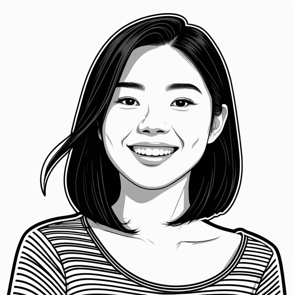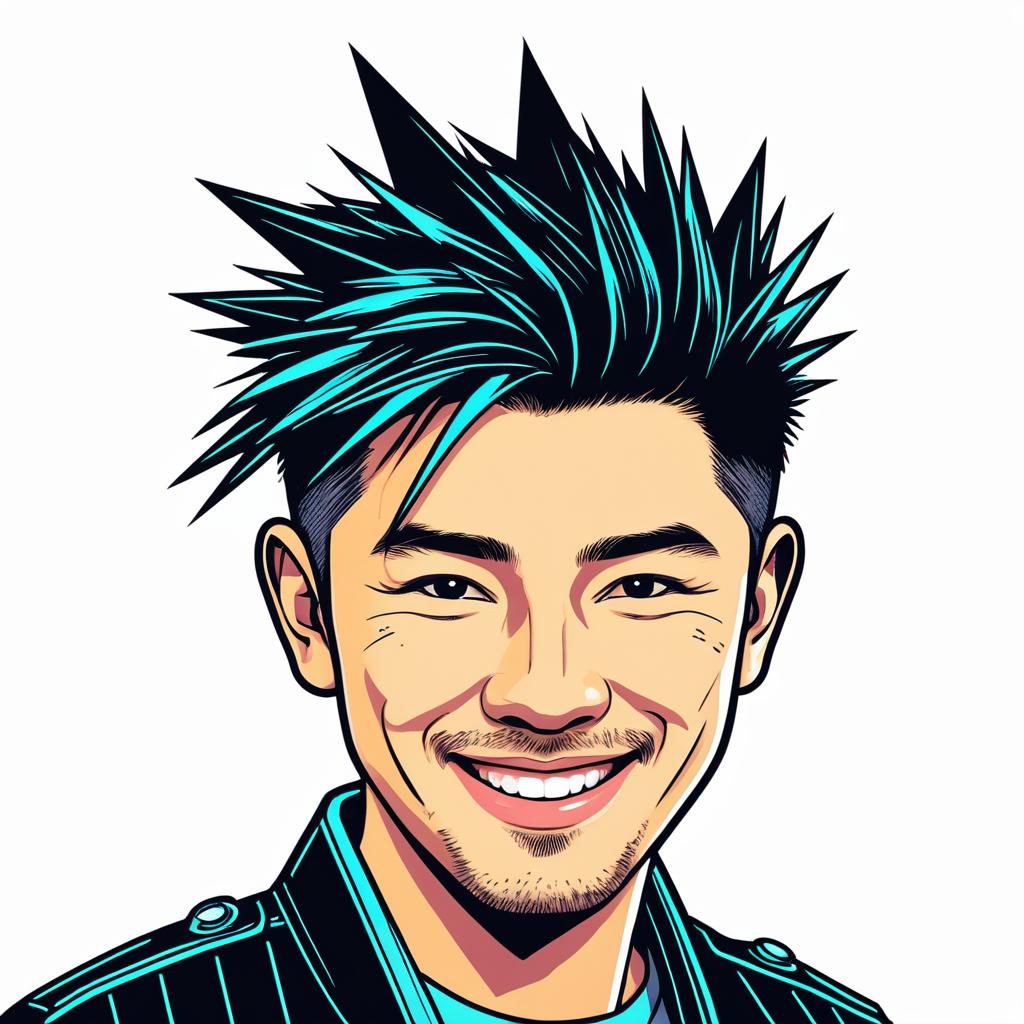 Illustration of a young man with thick black hair and beard, smiling brightly. He is wearing a casual blue denim jacket over a white t-shirt. The style is digital vector art with clean lines and vibrant colors on a light gray background.