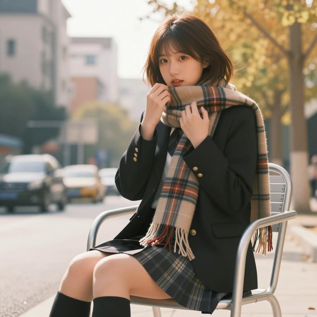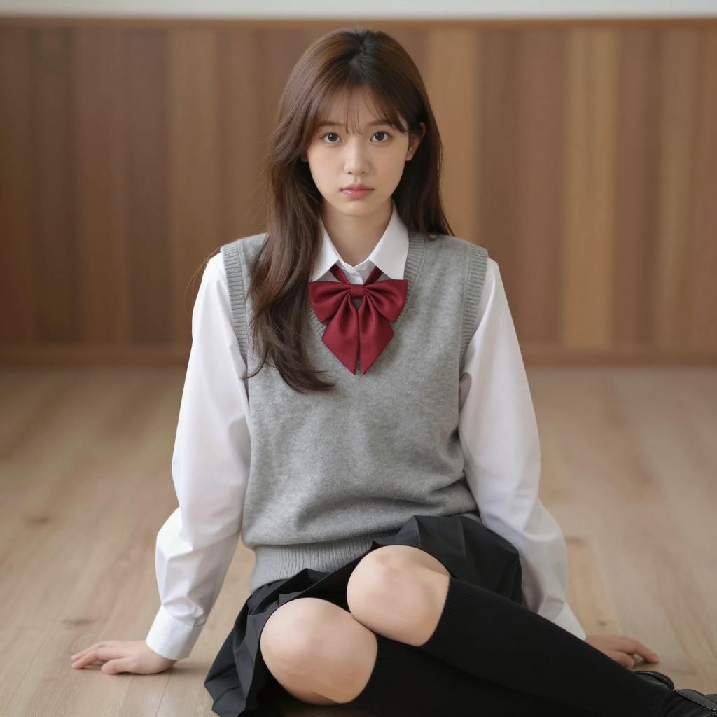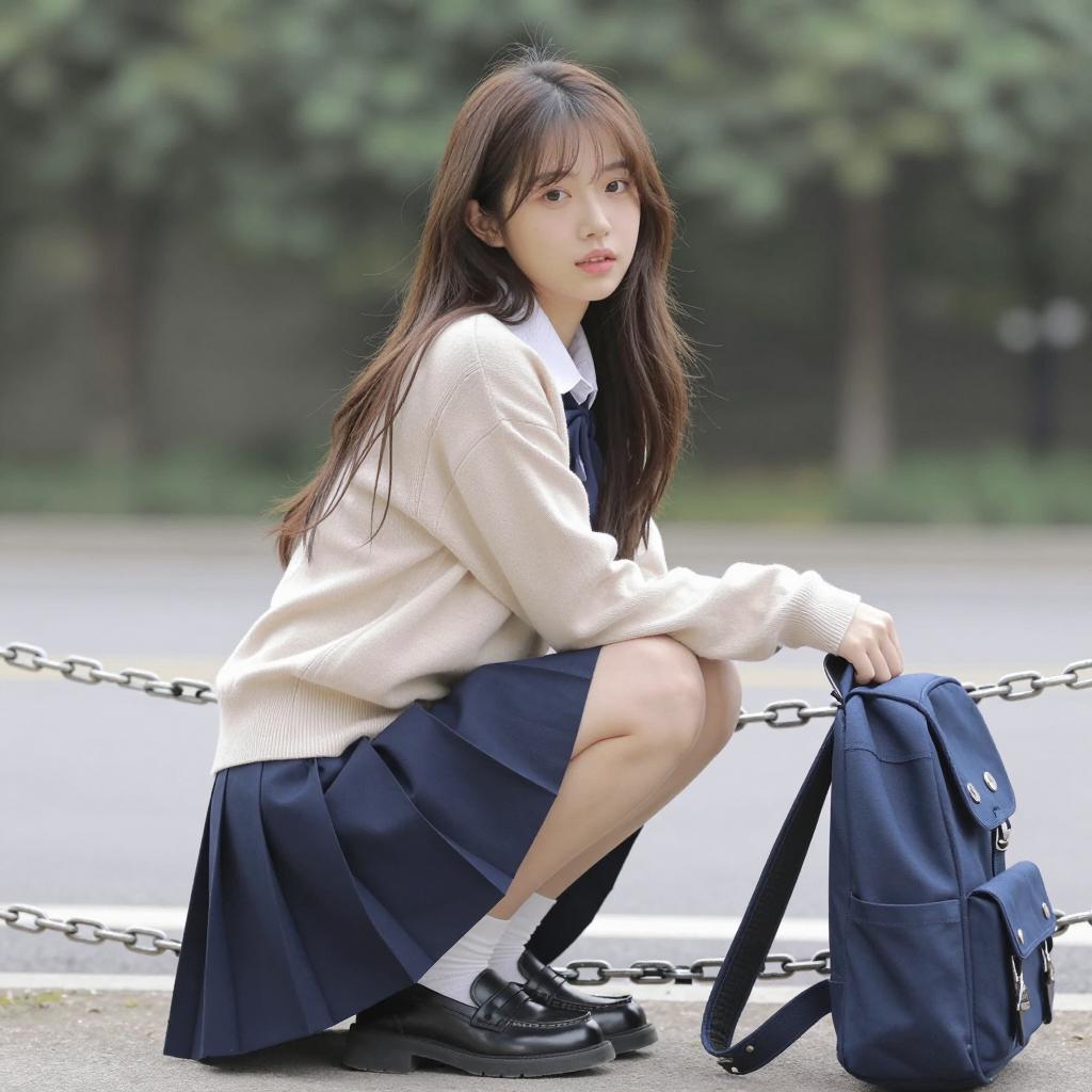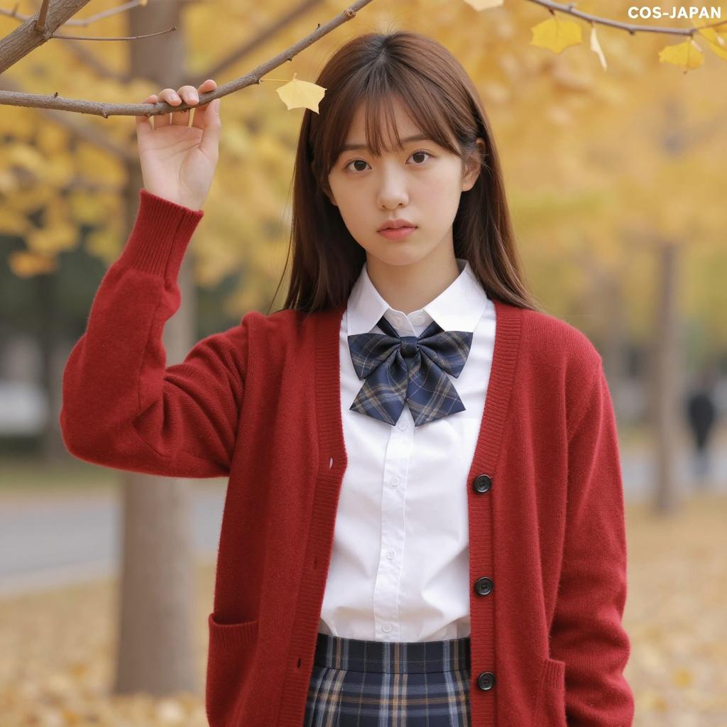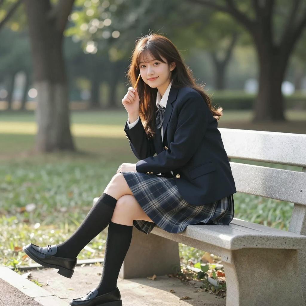 Asian woman with long brown hair, wearing a navy school uniform, white knee-high socks, black shoes, white gloves, and red scarf, sitting on a stone in a grassy field, legs crossed, looking directly at the camera. Bright daylight. "CKS x JAPAN" in the bottom right corner.