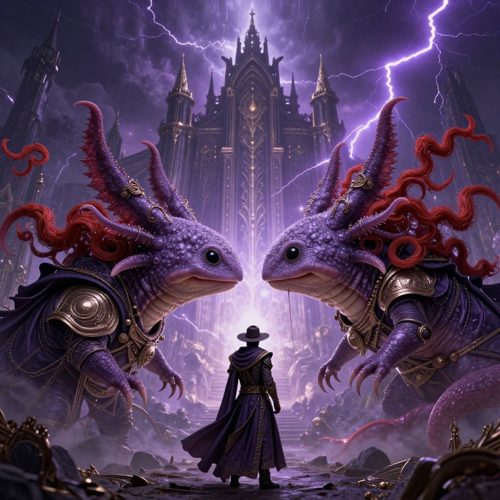 Attacker anthropomorph Axolotl-shvords war, face Axolotl synthesis, head of Axolotl, all skin=Axolotl (purple), long gills Axolotl, red curly, steampunk style, in the distance, cowboy shot, epic, majestic, magical, fantasy art, cover, dreamy, ethereal fantasy masterpiece concept art, super best quality, absurd, high detail, 8K, dark lilac armor, fanbing style clothing, magnificent, heavenly, ethereal, picturesque, intricate, elegant, very detailed, symmetry, magical atmosphere, sharp focus, very coherent, radiant, advanced, cinematic, artistic, fine detail, winning, beautiful, stunning, dramatic lighting, thoughtful design, rich deep colors, perfect professional background, environment, custom set composition. highly detailed. improvements, organic and artificial, dark skies, purple lightning.