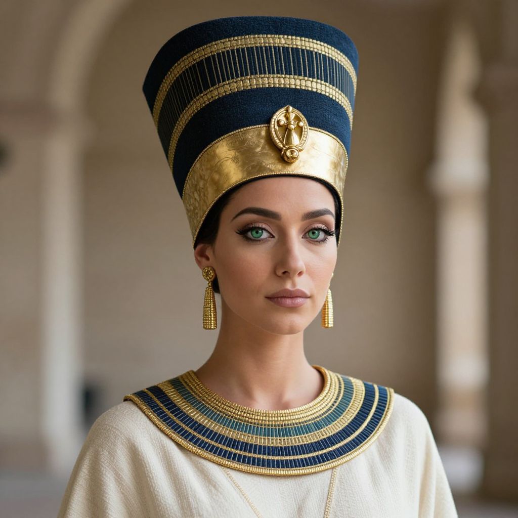 Photorealistic digital image of a young woman with fair skin and green eyes, dressed in ancient Egyptian attire. She wears a tall, dark blue and gold striped headdress with a golden band and emblem at the front, and gold, teardrop-shaped earrings. Her white robe has a dark blue and gold striped collar. The background is a blurred, beige stone archway, suggesting an ancient setting. Her makeup is subtle, enhancing her natural features. The image has a polished, high-detail finish, capturing the textures and colors vividly.