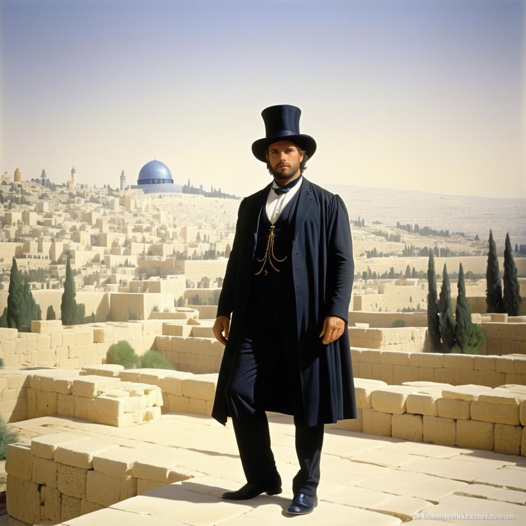 Full body portrait of a strong, handsome 30-year-old man wearing a top hat and formal vintage suit with a long coat, standing in ancient Jerusalem around 600 BC. The background features the historic cityscape with stone buildings and the Dome of the Rock. The scene blends a cinematic style inspired by Norman Rockwell and Carl Heinrich Bloch photography.