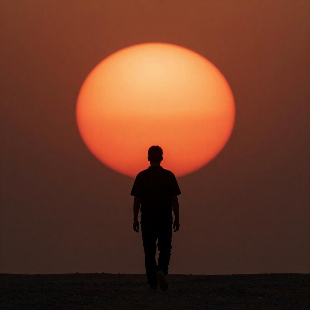 Silhouetted man walking toward enormous, glowing red-orange sun with large rings, set against dark, hazy background. Man in dark shirt and pants, no facial expression visible. Desert-like ground in foreground. Intense, surreal, cinematic style.
