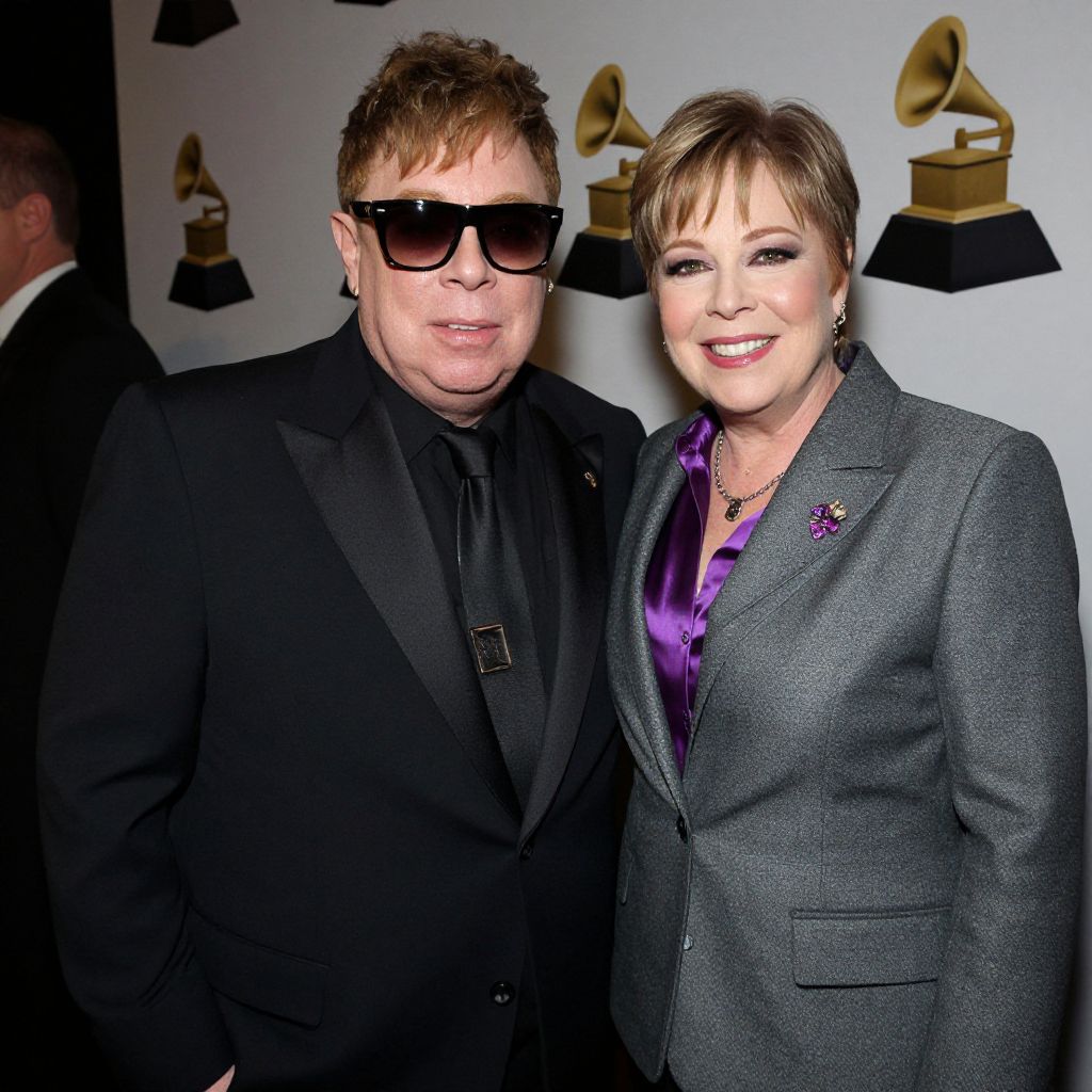Elton John, wearing sunglasses and a black suit, stands arm-in-arm with a smiling woman in a gray blazer and purple shirt, both posing backstage at the 60th Annual GRAMMY Awards during \"I'm Still Standing: A GRAMMY Salute To Elton John.\