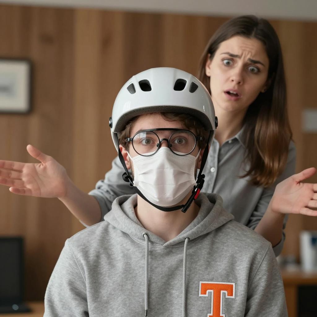 Young man with light skin, wearing a white helmet, safety mask, and round glasses, in a grey hoodie with an orange "T" emblem. Brown-haired woman with light skin, in a grey shirt, stands behind him. Indoor setting with wooden walls and a lamp. Man's mouth open, surprised expression. Woman looks concerned. Both arms outstretched.
