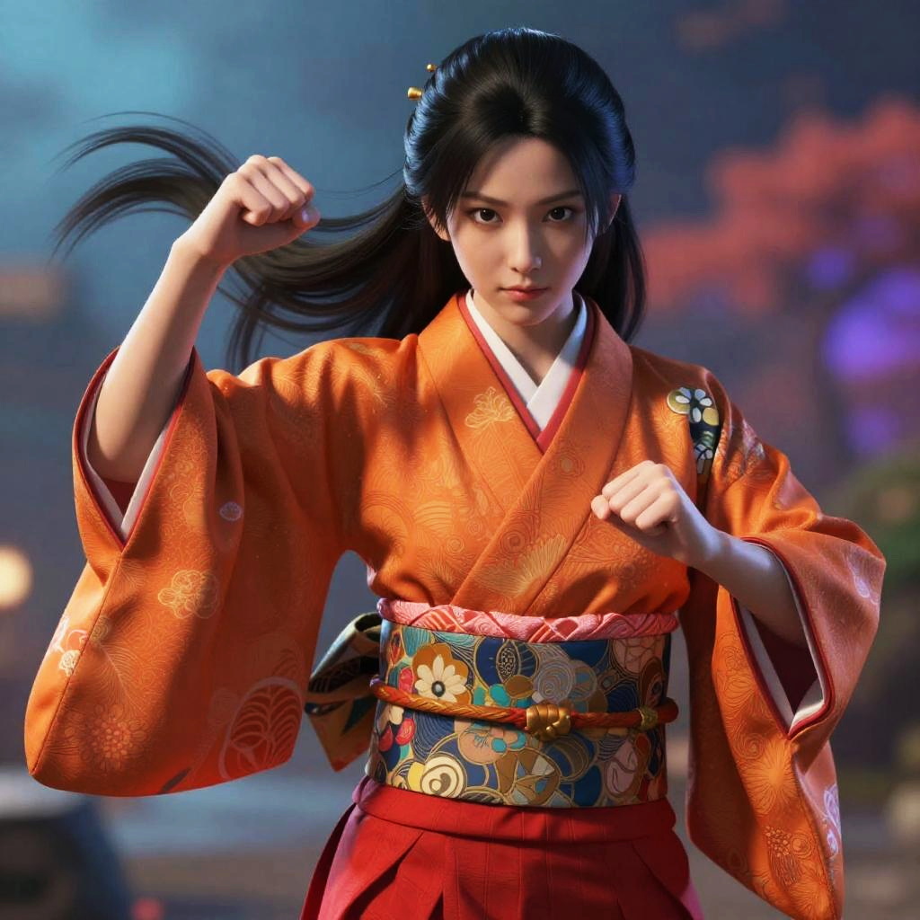 Masterpiece, absurdres, (intricate details), (colorful), cinematic lighting, bust shot, extremely detailed CG unity 8k wallpaper, hyuuga hanabi, 1girl, solo, orange kimono, red hakama skirt, obi, wide sleeves, looking at viewer, closed mouth, wind, fighting stance, low tied long hair