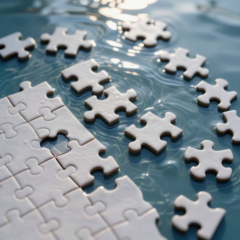 Photograph of white puzzle pieces scattered on a glossy blue surface with rippling water reflections. Some pieces are connected in a partial row on the left, while others float randomly across the image. The sunlight creates a shiny, reflective effect on the water, enhancing the contrast between the white puzzle pieces and the blue background. The image has a modern, clean aesthetic with a focus on simplicity and partial completion.