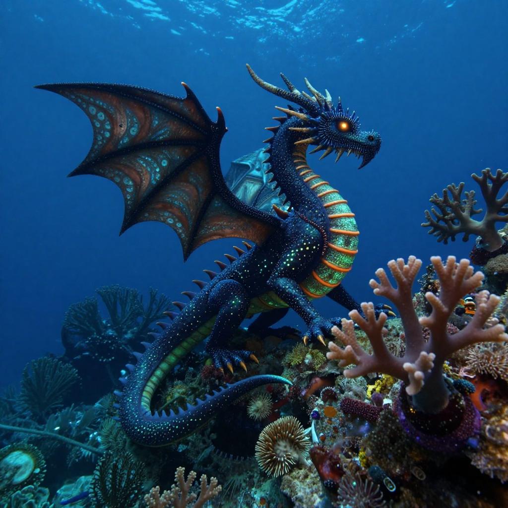 Bioluminescent coral dragon perched in sunken cathedral reef. Shot on Phase One XT IQ4 150MP, (hyperdetailed), 8K HDR, dramatic lighting, cinematic atmosphere.