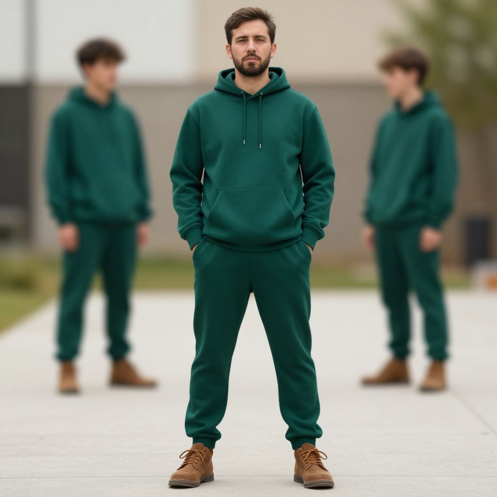 A man, camo print oversized hoodie, black tapered joggers, high-top canvas sneakers, bold red accents, soft cotton blend, high-tech warehouse, automated sorting systems, bright LED lighting overhead, 3M ferrania analog film stock, confident expression Man has masculine face and piercing eyes
