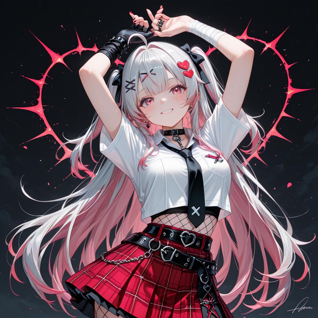 1girl, solo, long hair, smile, skirt, gloves, heterochromia, hair ornament, fingerless gloves, bow, hair bow, jewelry, black gloves, plaid skirt, multicolored hair, fishnets, looking at viewer, shirt, plaid, earrings, black bow, nail polish, belt, heart, red shirt, short sleeves, grin, crop top, single glove, bangs, red skirt, cowboy shot, arms up, bandages, hairclip, choker, ahoge, black nails, signature, pink eyes, necktie, bandaged arm, very long hair, spikes, midriff, collar, pleated skirt, black choker, black necktie, pink hair, polka dot, blush, ear piercing, miniskirt, grey eyes, grey hair, piercing, hands up, multicolored nails, heart hair ornament, streaked hair, black collar, black belt, white hair, red eyes, red nails, frills, safety pin, x hair ornament, ring, breasts, buckle, badge, chain, spiked bracelet, character name, bracelet, pink background, cropped legs, single fingerless glove, navel, sidelocks, spiked collar, studded belt, gradient hair, belt buckle, fishnet pantyhose, two-tone hair, multicolored skirt, heart earrings, standing, button badge, teeth, red hair, collarbone, off shoulder, polka dot bow, red jacket, artist name, ribbon, off-shoulder shirt, virtual youtuber, wavy hair, border, cropped jacket, hair ribbon, wristband, black ribbon, food-themed hair ornament, clothes writing, frilled shirt, pantyhose, english text, medium breasts, small breasts, outside border, half gloves, black skirt, colored tips, heart ahoge, twitter username, black shirt, pink nails, crop top overhang, bandaged leg, fingernails, white shirt, two side up, mole, two-tone background, asymmetrical gloves, rose, flower, asymmetrical clothes