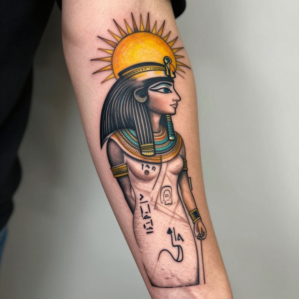 Egyptian goddess Isis tattoo sleeve, bold outlines with intricate patterns, radiant sun disk behind her head, mystical hieroglyph symbols, modern and artistic style
