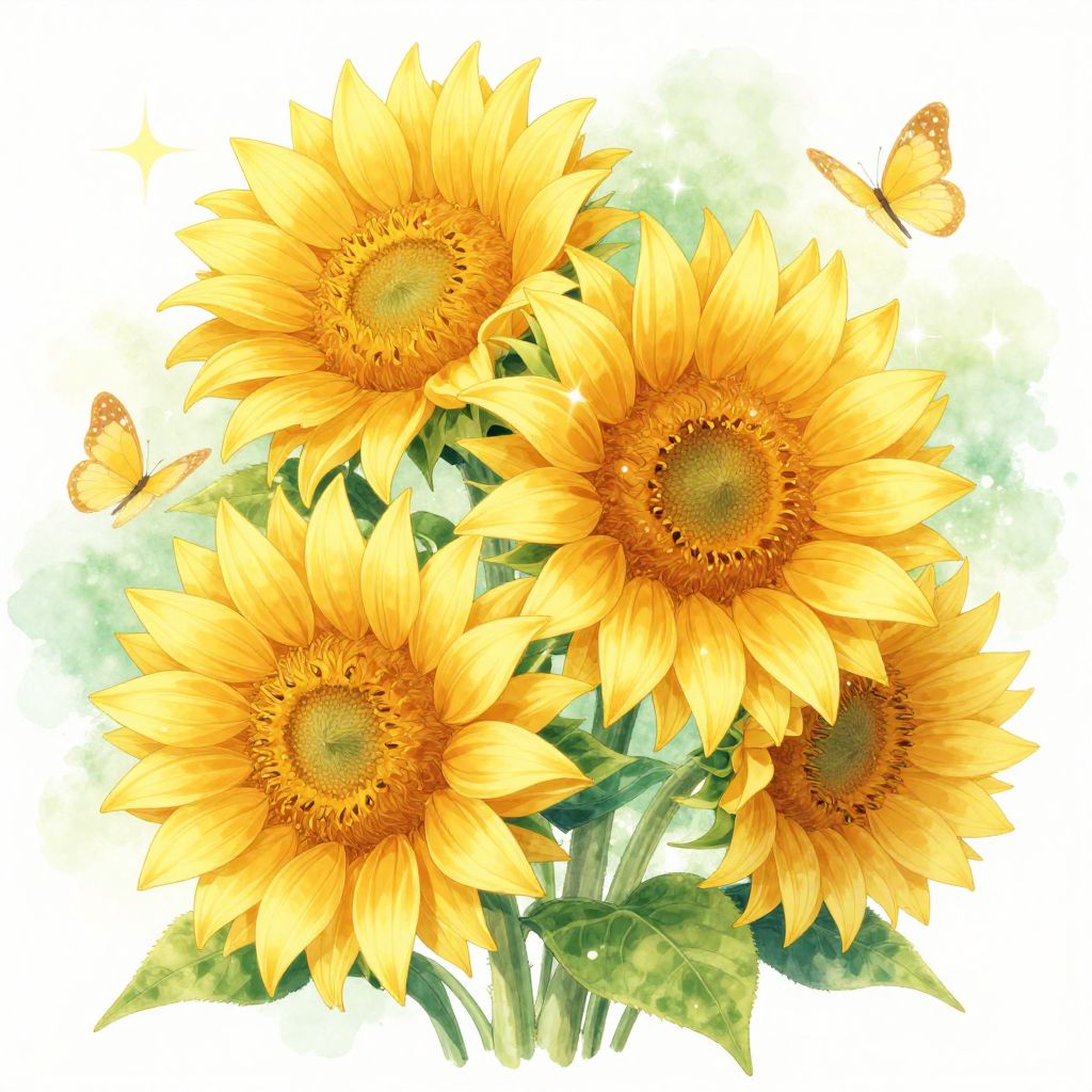 Anime flowers drawing featuring large sunflowers with intricate petal details, watercolor effect in bright yellows and greens, surrounded by fluttering butterflies and soft sparkles, gentle breeze effect, elegant and serene composition