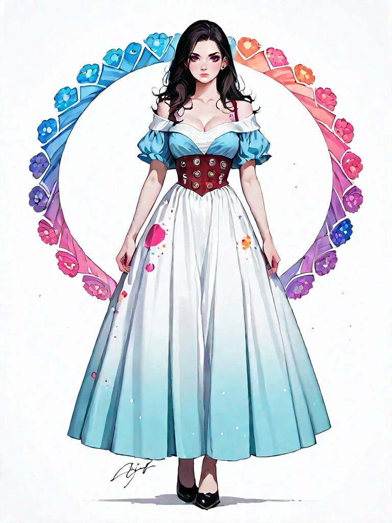 1girl, source_comics, realistic face, full body shot, Woman, romantic style, off-the-shoulder burgundy gown with a sweetheart neckline, embroidered lace bodice, sheer tulle overlay, full-length skirt with a soft, flowing silhouette, white background.