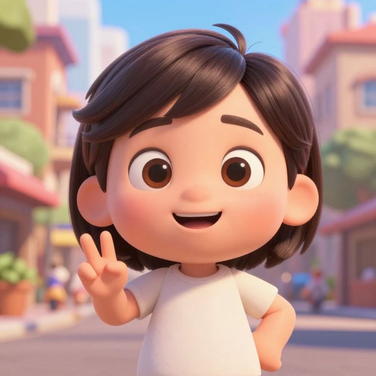 Turn yourself into Pixar character with exaggerated, charming facial features, smooth shading, glossy hair, playful pose, in a lively cartoon cityscape, warm lighting, Pixar-style charm and emotion, high detail, cute and approachable expression