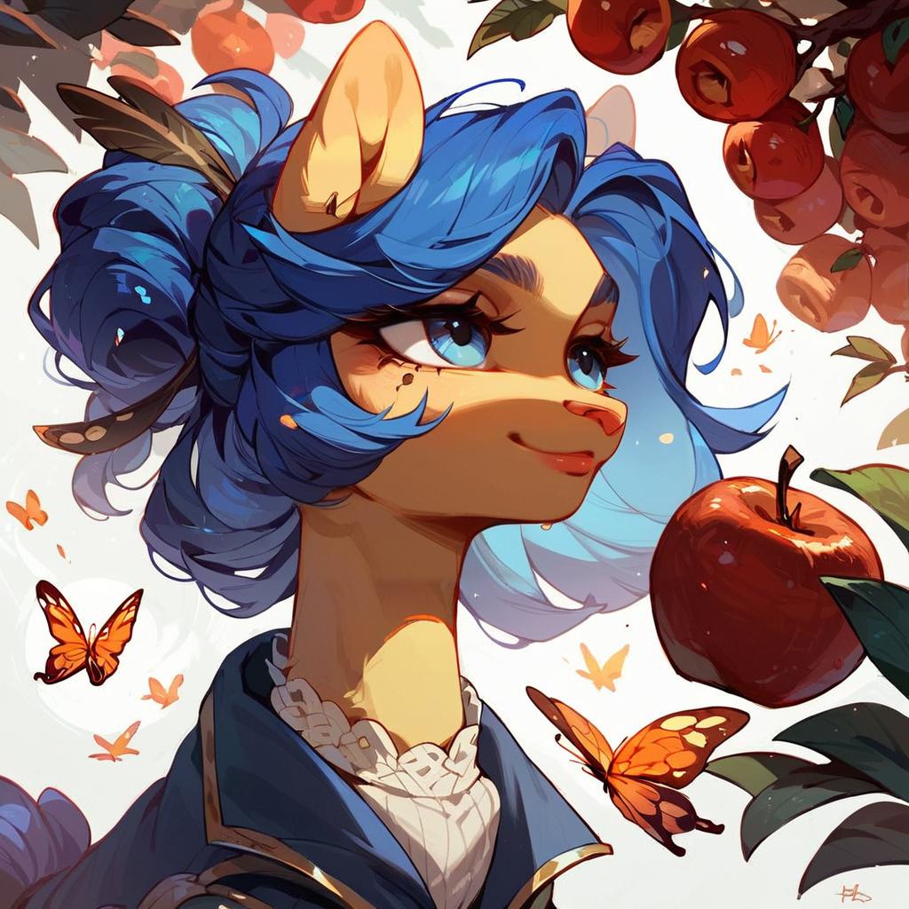 Score_9, score_8_up, score_7_up, score_6_up, score_5_up, score_4_up, source_pony, woman playing with a butterfly near a apple tree, feral, solo focus, rating_safe