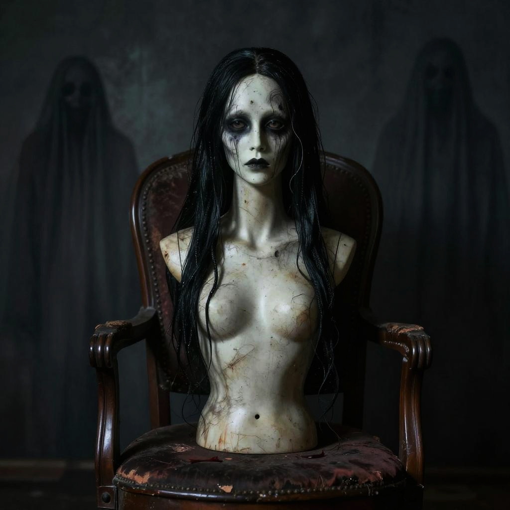 Realistic photo.Spooky mannequin placed on a worn-out chair with a hidden specter, gazing intensely into the camera, nightmare digital art, ultra-detailed, aesthetic horror style realistic photo