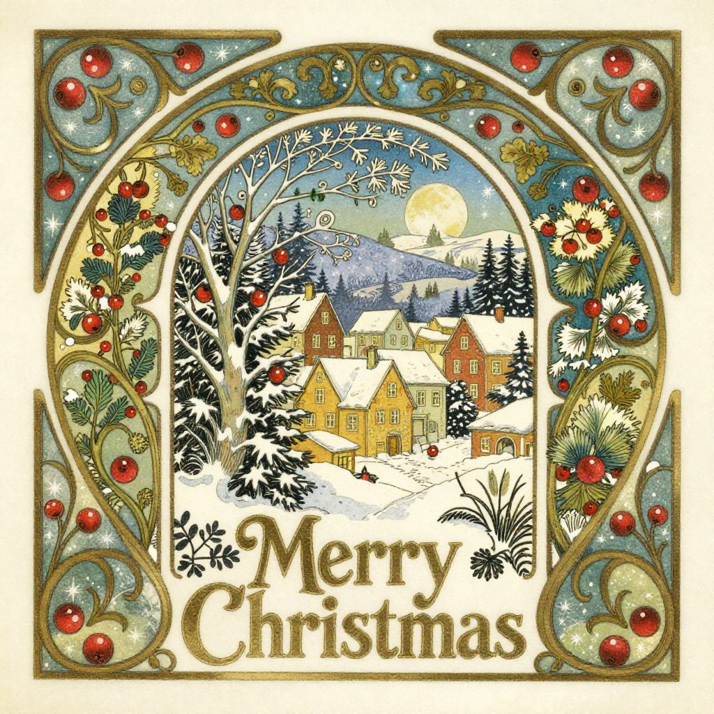 Art nouveau Christmas cards showcasing intricate hand-drawn borders with curling vines and berries, central scenes of peaceful snowy villages framed by stylized winter flora, rich jewel-tone backgrounds, and classic decorative lettering spelling ‘Merry Christmas.’
