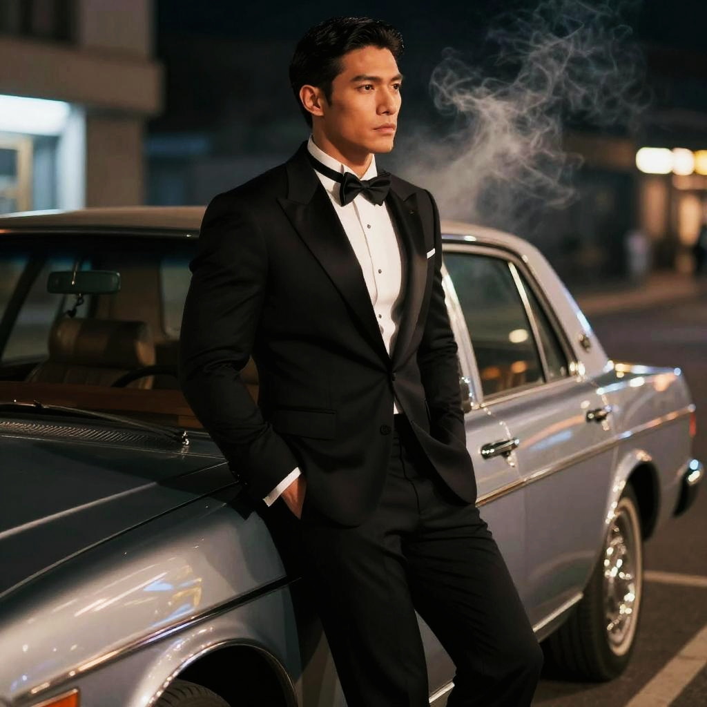 Photograph of a handsome man in a black tuxedo with a bow tie, standing by a silver classic car at night, with smoke curling