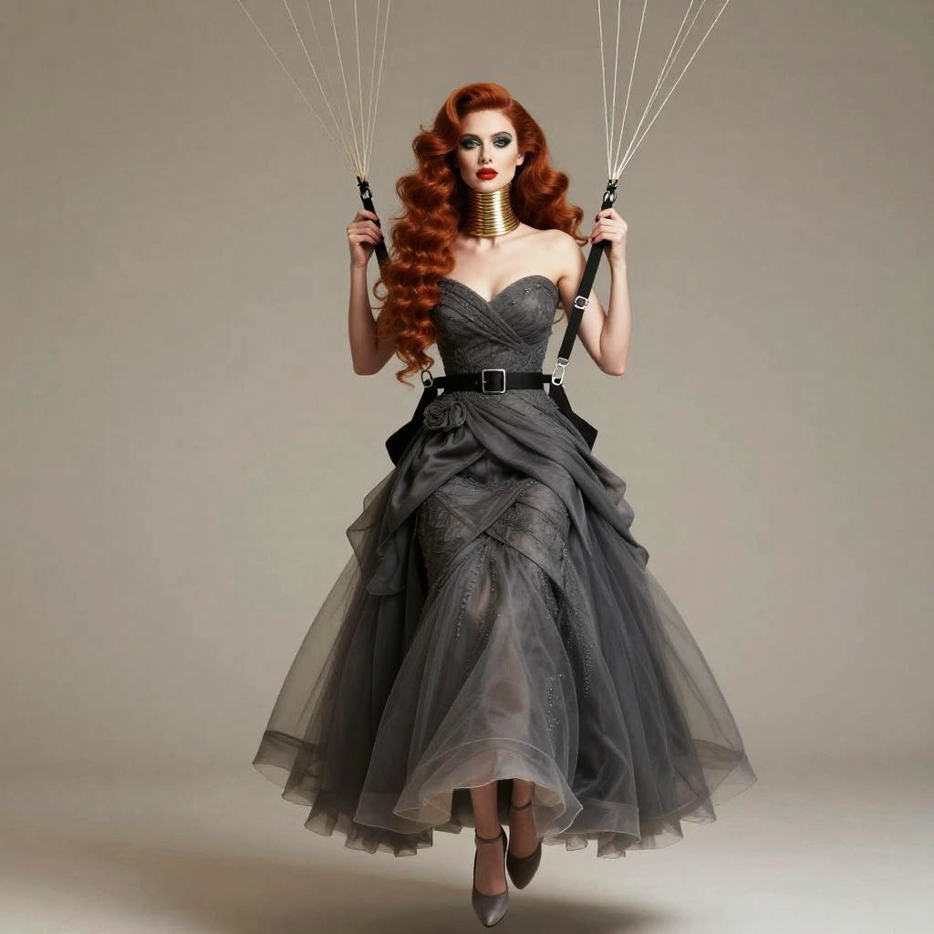 Realistic photo.The witch doctor, a stunning woman, model, 31 years old, with a long neck, real pale skin texture, amazing makeup, very long wavy auburn hair, wearing a modern charcoal gray wedding dress, floating in the air with a parachute, in retrofashion, sharp focus, hyper-realistic, photo-realistic, model pose, editorial Vogue photography, depth of field, fine details, full body format realistic photo