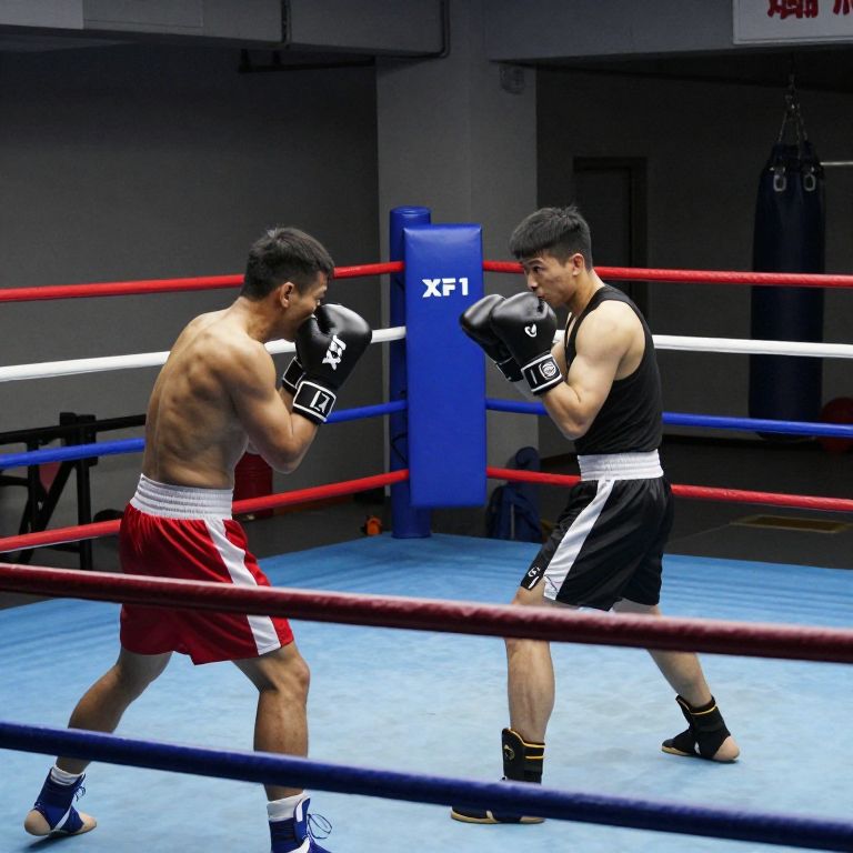 Two boxers engage in a sparring session within a 12 by 12 ring, surrounded by red and blue ropes, while practicing one-on-one pad drills with a blue punching bag labeled \"XF1\" positioned behind them.