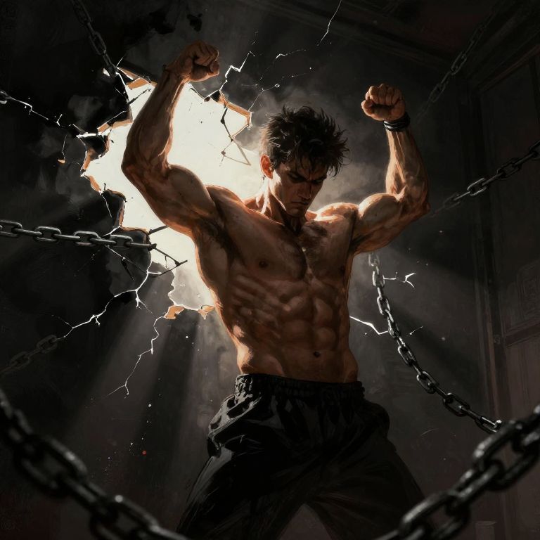 Stronger figure breaking free from chains in a dark room, muscles tense, light bursting through cracks, symbolizing liberation and empowerment, intense and emotive atmosphere, cinematic lighting, digital painting style.
