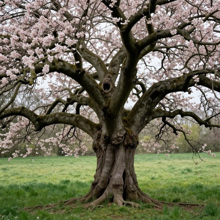 Photograph of a large, mature tree with a thick, gnarled trunk and wide, arching branches covered in light pink cherry blossoms. The tree stands in a lush green grassy field, with a blurred background of more trees and a bright, overcast sky. The trunk has a textured, dark brown bark with visible grooves and knots. The pink flowers create a soft, delicate contrast against the tree's rough texture. The overall scene exudes a serene, springtime ambiance.