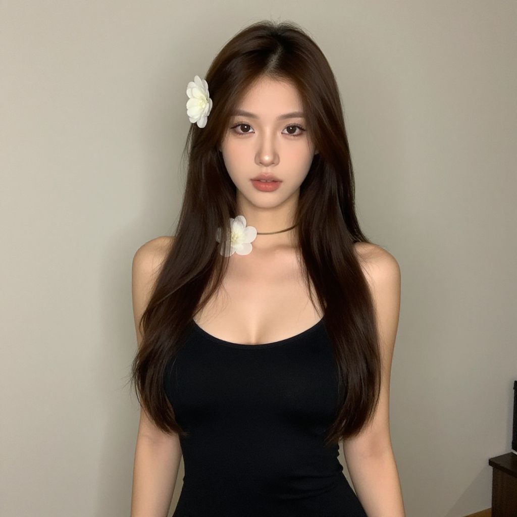 Photograph of an East Asian woman with long, straight, dark brown hair adorned with white floral hairpins on her left side. She has fair skin, almond-shaped brown eyes, and a neutral expression. She wears a simple, black, sleeveless tank top that reveals her shoulders and upper chest, and a black choker necklace. The background is a plain, light gray wall, and there is a small, dark brown piece of furniture partially visible on the right edge. The image has a slightly soft, almost digital filter effect, giving it a slightly surreal appearance.
