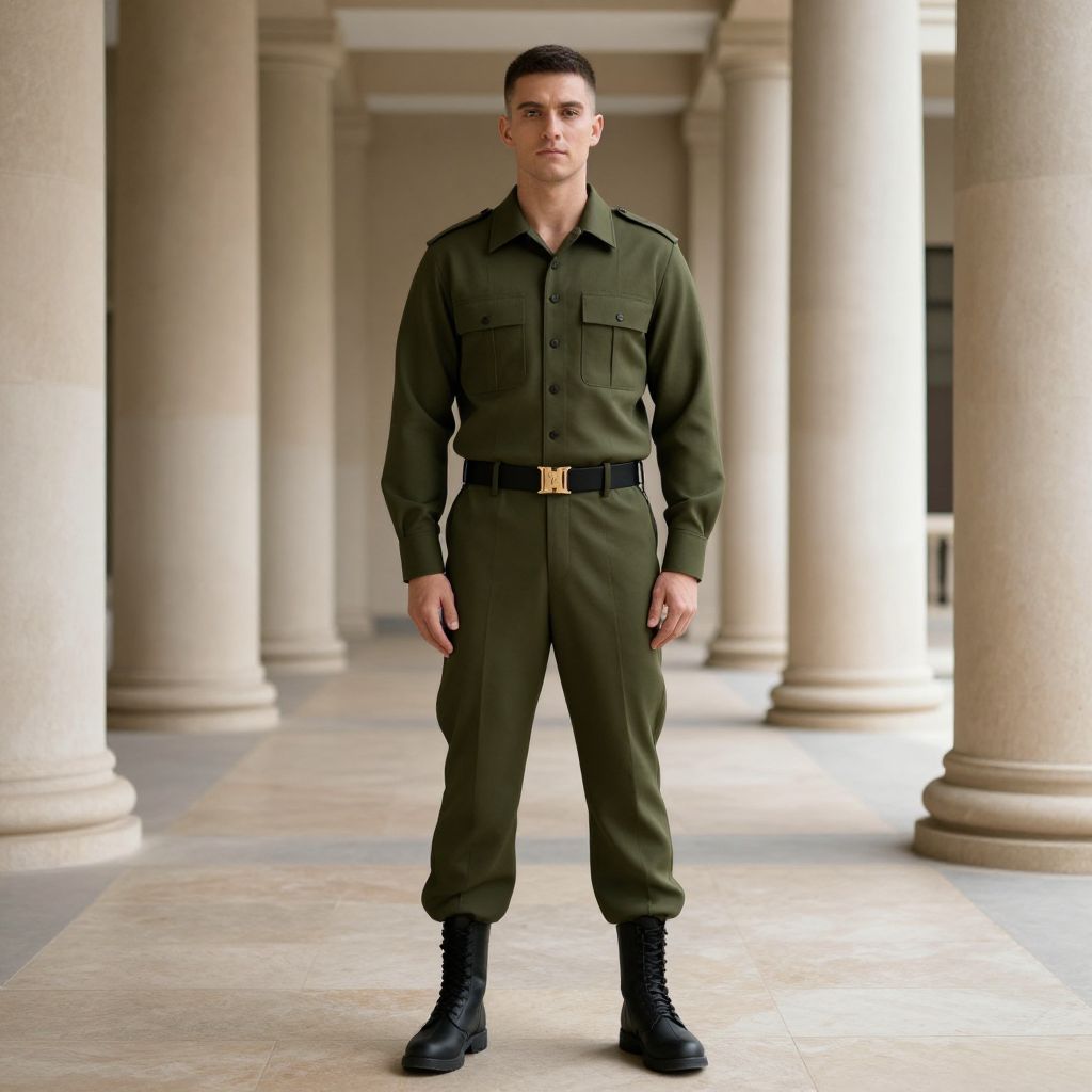 Military Shirt Costume, man in uniform standing in a hall with columns