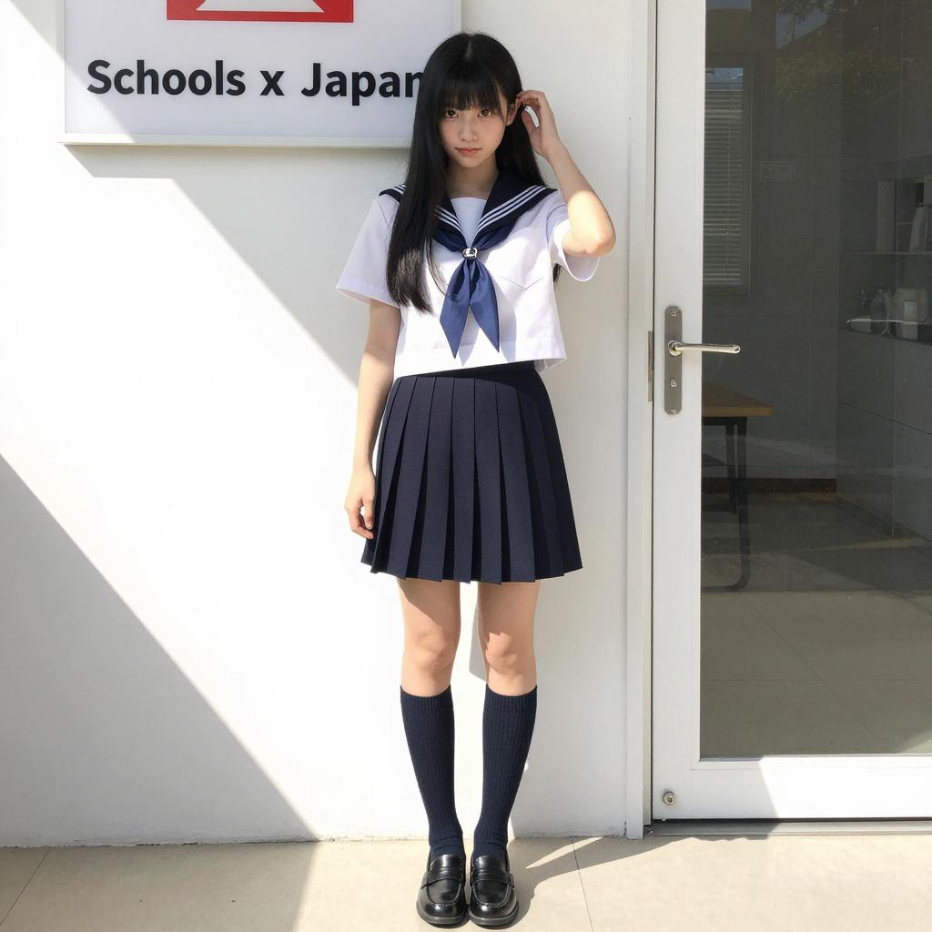 Japanese schoolgirl photograph. Long black hair, bangs, white sailor top with blue necktie, short dark blue pleated skirt, navy knee-high socks, black loafers. Standing in bright sunlight, right hand touching hair, left arm relaxed. Bright white background, glass door to the right, "Schools x Japan" sign above. Sunlight creates strong shadows.