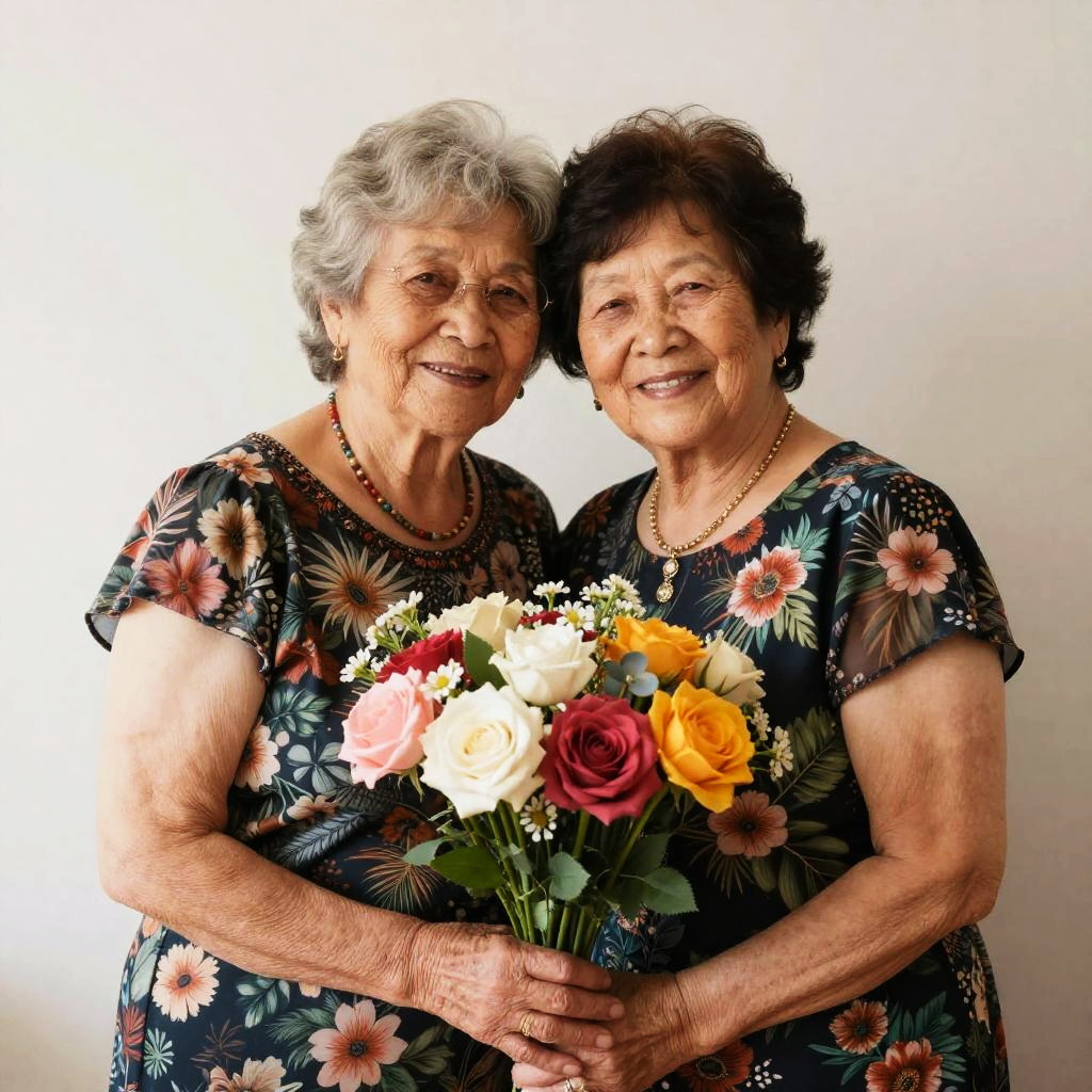 Realistic photo.two grandmothers hugging each other, posing for a photo, dressed in floral print dresses, holding a bouquet of flowers. realistic photo