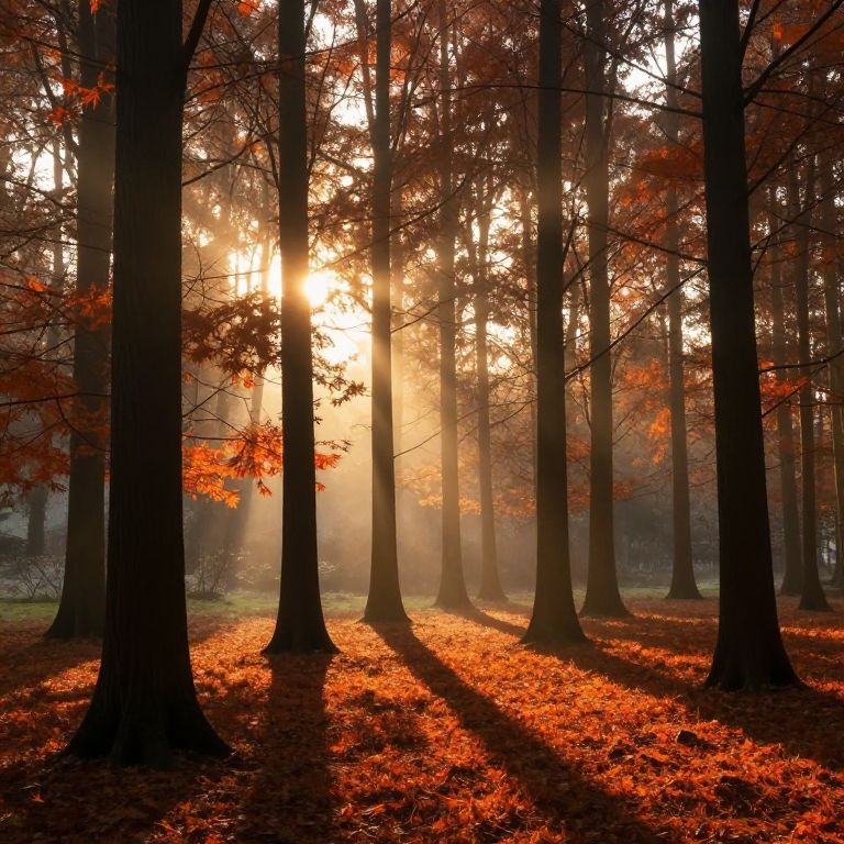 Photograph of a serene forest at sunrise. Tall, straight trees with dark trunks stand in the foreground, their shadows stretching across the ground. The sun peeks through the trees, casting a golden, warm light that illuminates the vibrant orange and red leaves scattered on the forest floor. Mist adds a soft, ethereal glow to the background, creating a peaceful, autumnal atmosphere.