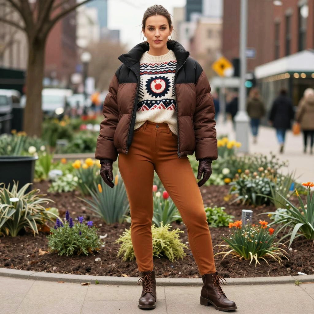 A stylish woman stands confidently in an urban community garden wearing a two-tone brown and black oversized puffer jacket over a wide ribbed knit sweater with a bold graphic pattern. She pairs this with caramel-colored fitted trousers, lace-up dark brown ankle boots, and matching leather gloves. Her hair is neatly tied back, accessorized with small hoop earrings. The city background features blurred pedestrians and buildings, highlighting a vibrant, colorful urban winter scene.