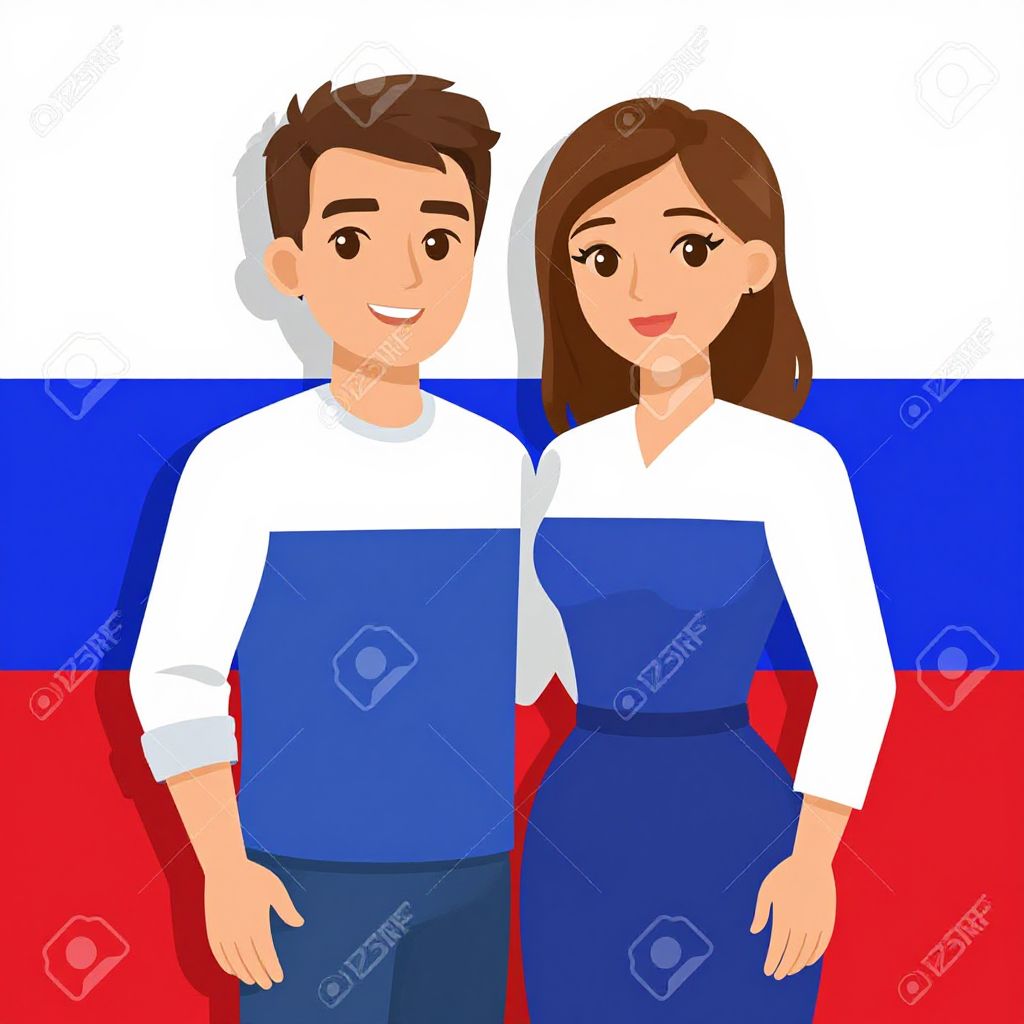 Digital illustration of a smiling brown-haired man and woman in white shirts and blue aprons, standing against a Russian flag background.