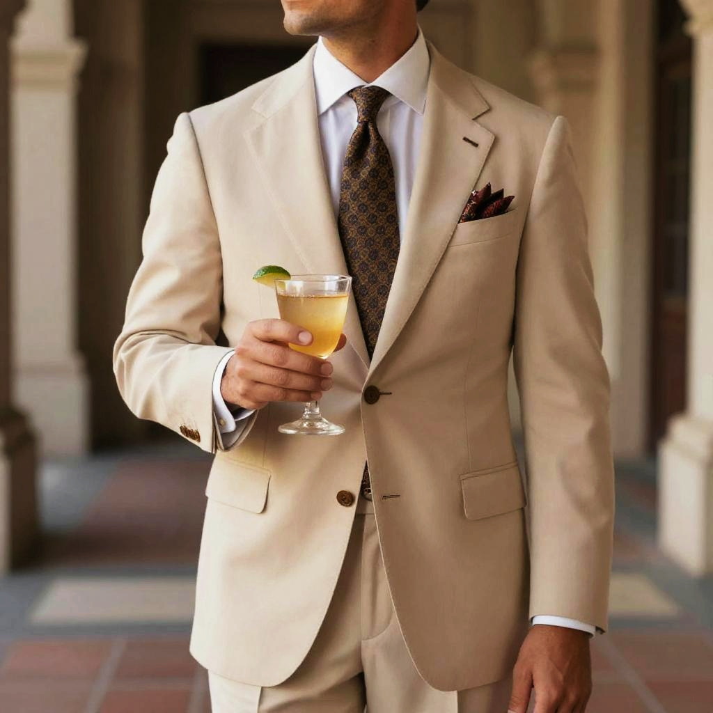 A dapper gentleman exemplifies California cocktail attire, dressed in a stylish beige suit complemented by a patterned tie and pocket square, set against an elegant architectural backdrop.