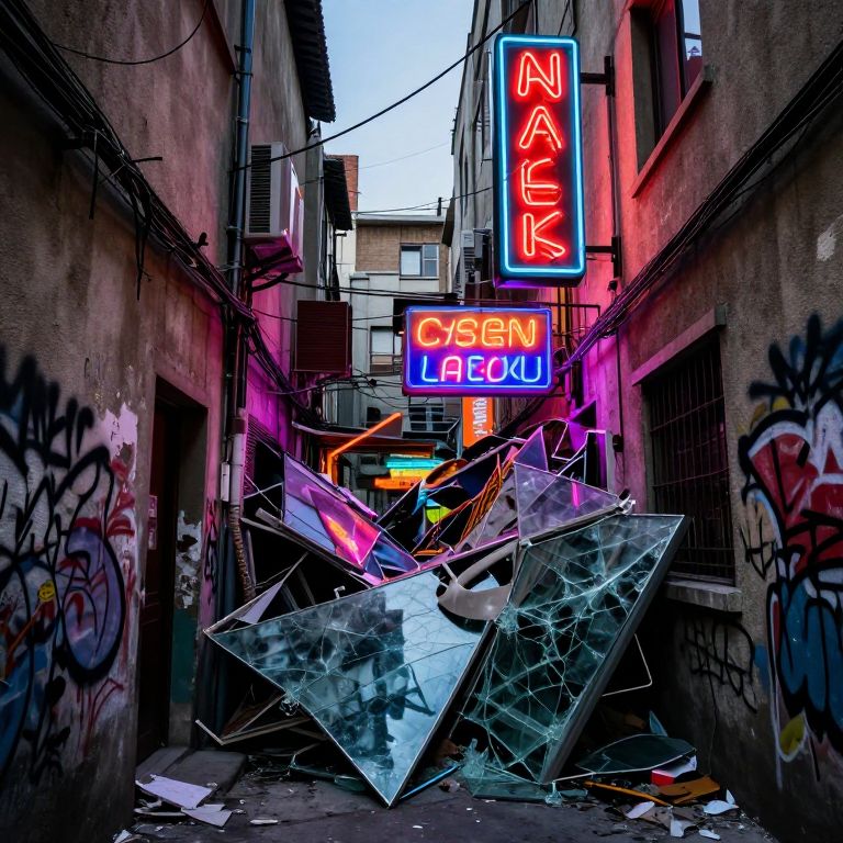 A high-resolution photograph of a chaotic urban alleyway at dusk, filled with noise and clashing textures—rough concrete walls, tangled wires, old graffiti, shattered glass, and vibrant neon signs glowing in bold colors, creating a visual overload with intense contrasts and sharp, jagged edges.